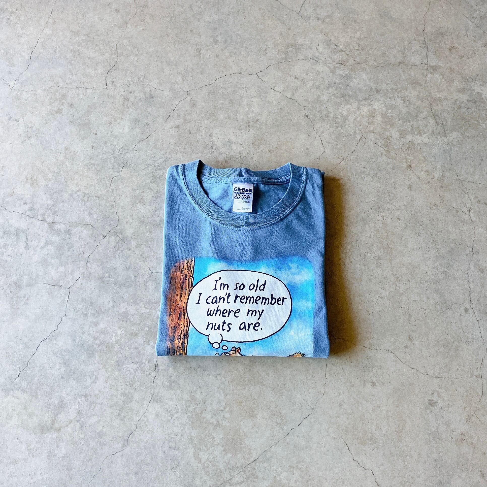 90's GILDAN comical art print tee "I'm so old I can't remember where my nuts are." made in Honduras